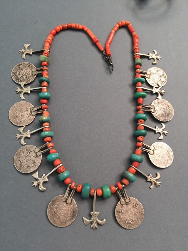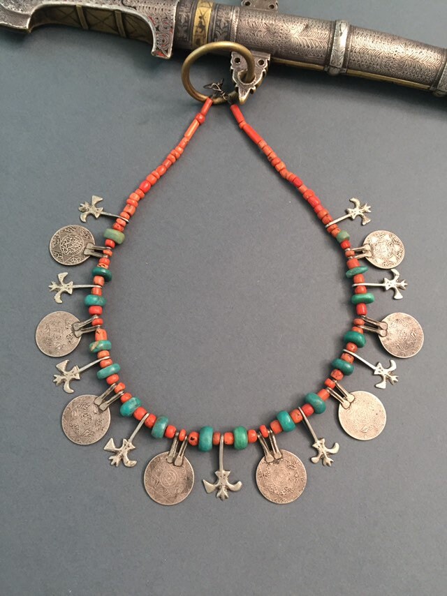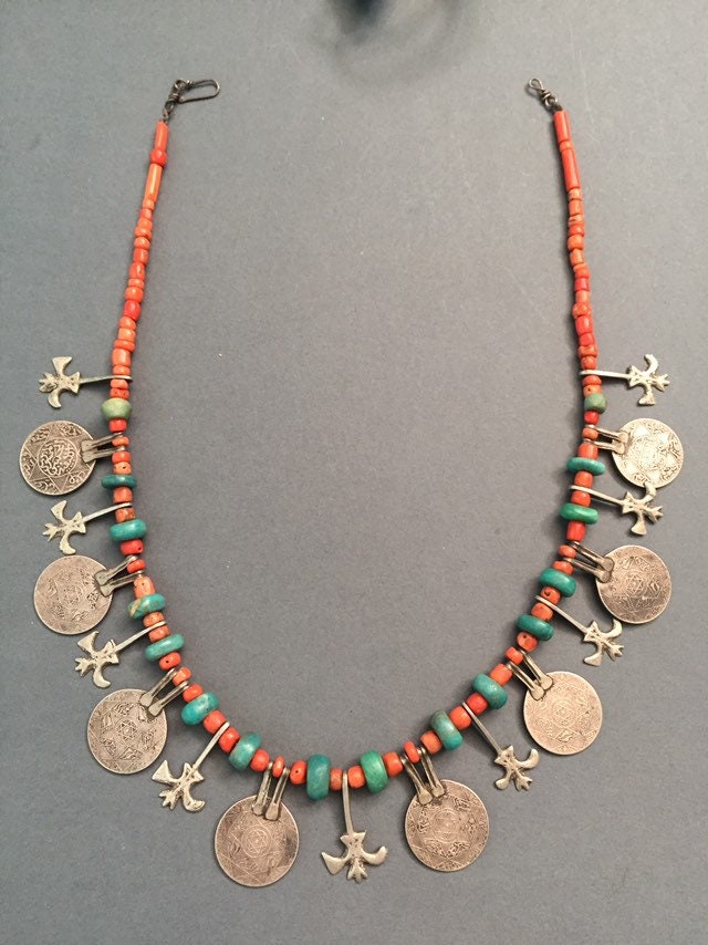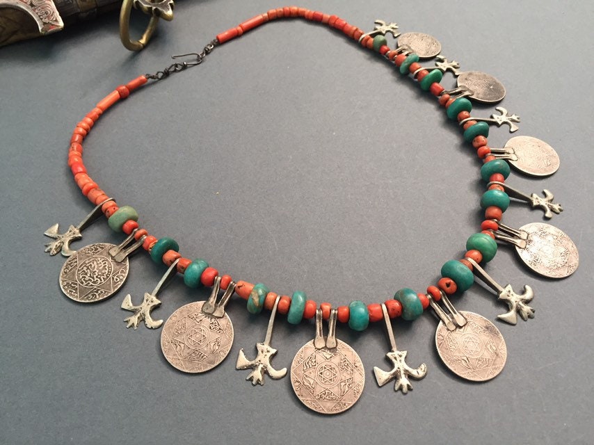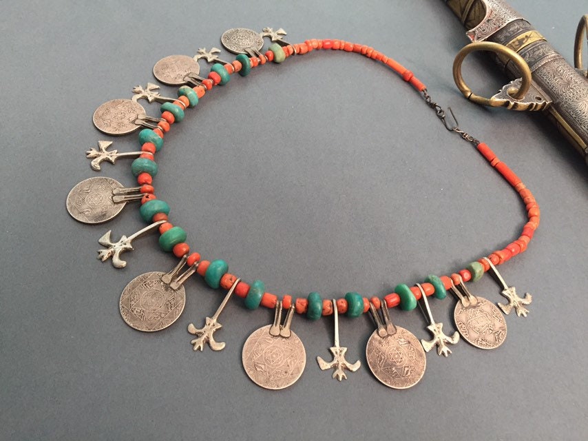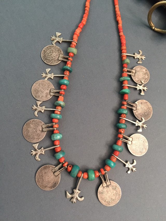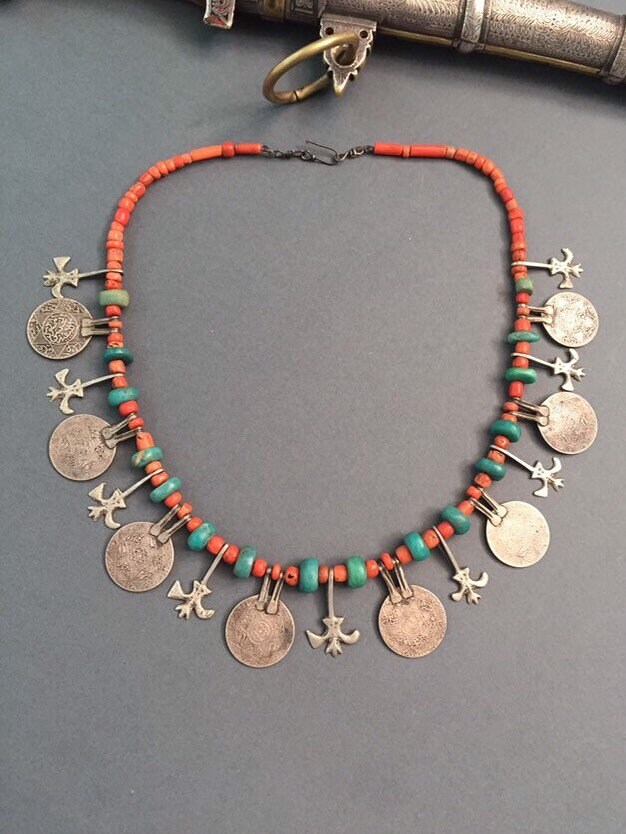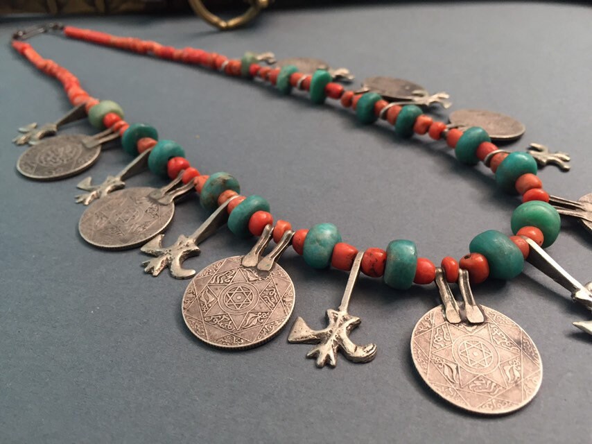 Antique berber necklace composed antique berber silver coins,antique berber silver pendants,antique berber natural coral,Natural vintage berber Amazonite,silver clasp.