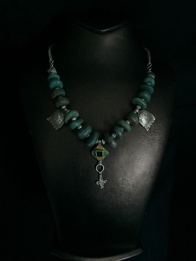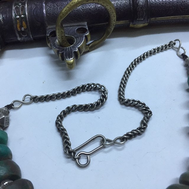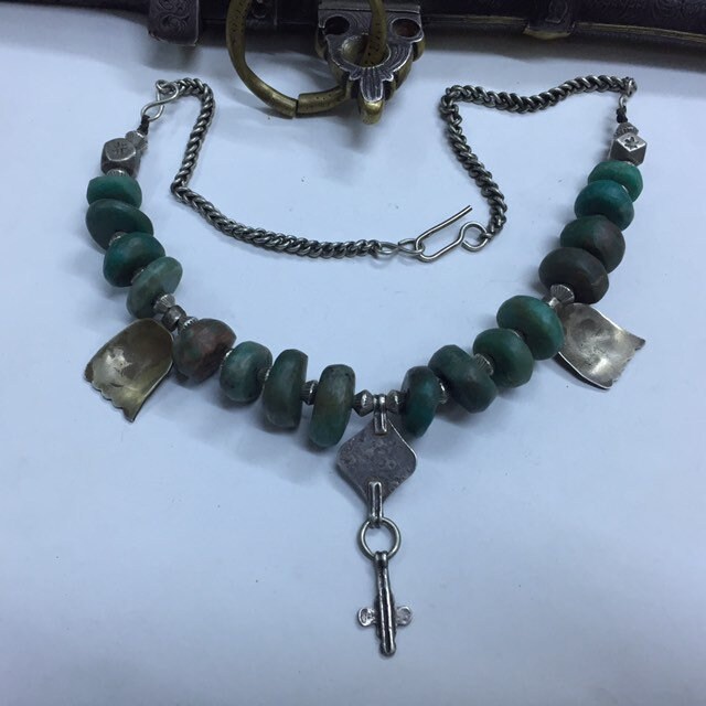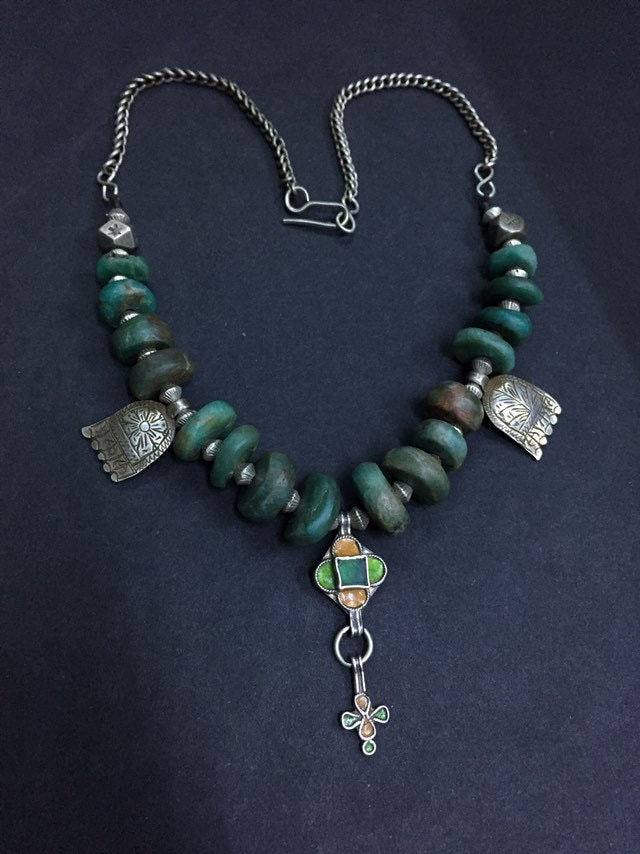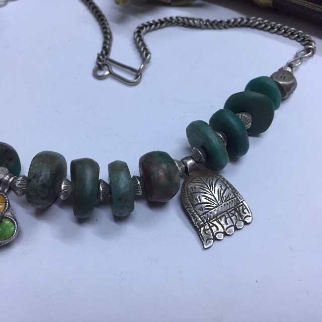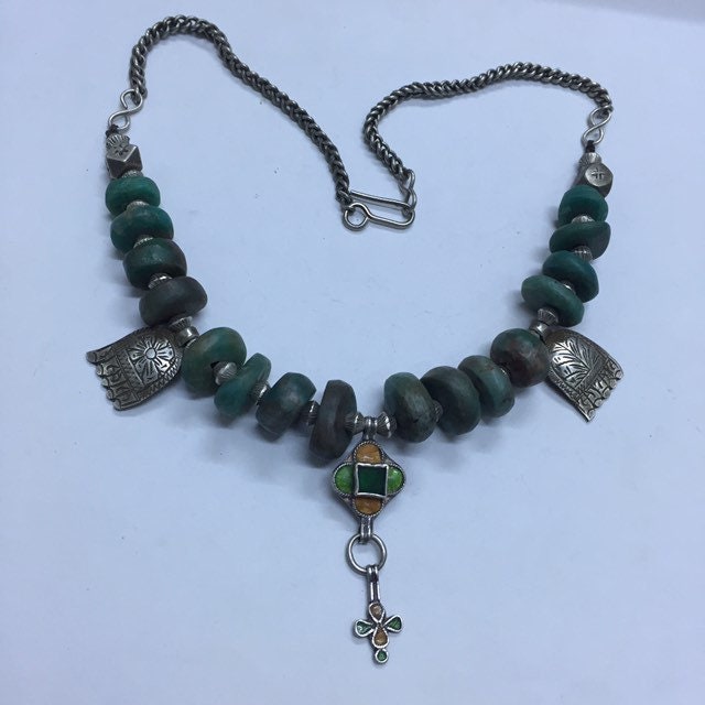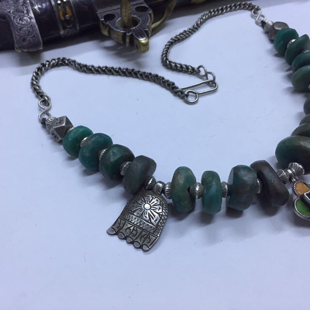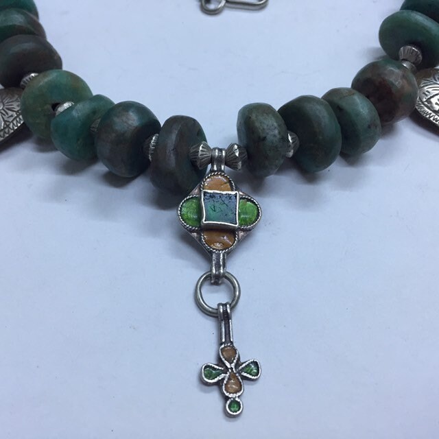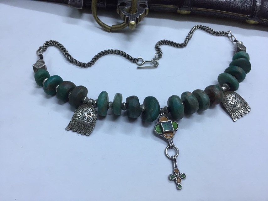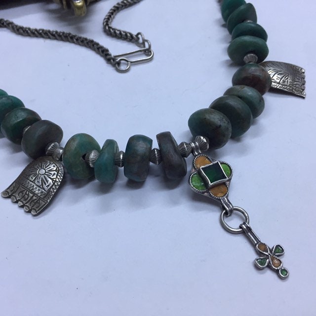 Natural Moroccan Amazonite from Tata region,antique berber silver and enamel pendant,berber silver Khamsa,Antique Berber silver chain,silver clasp.