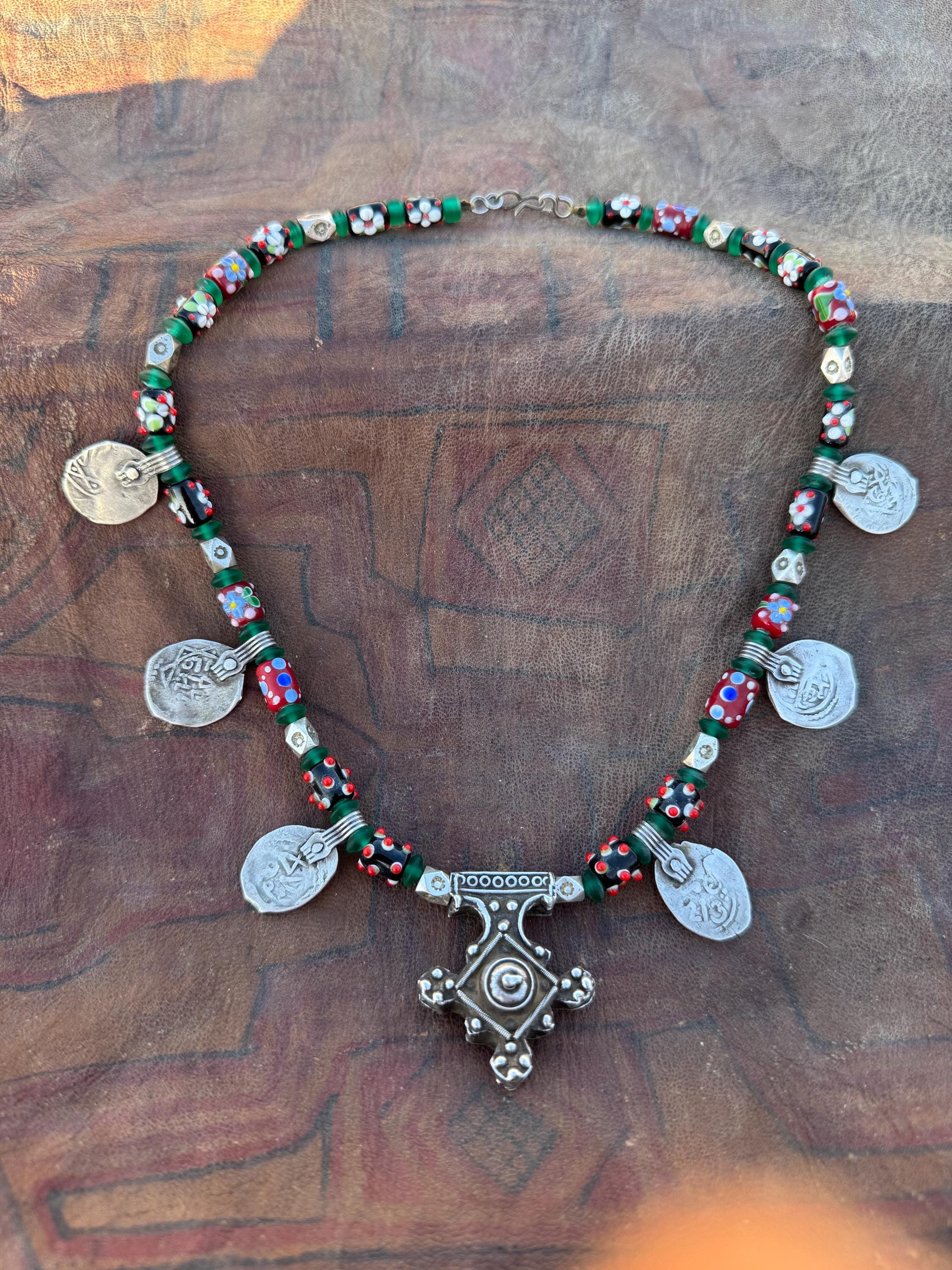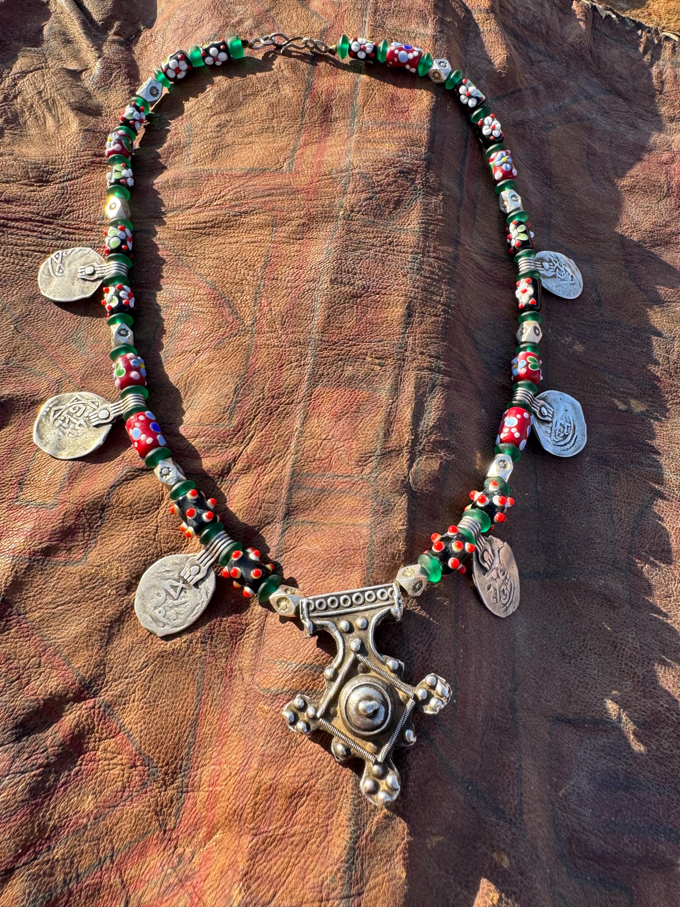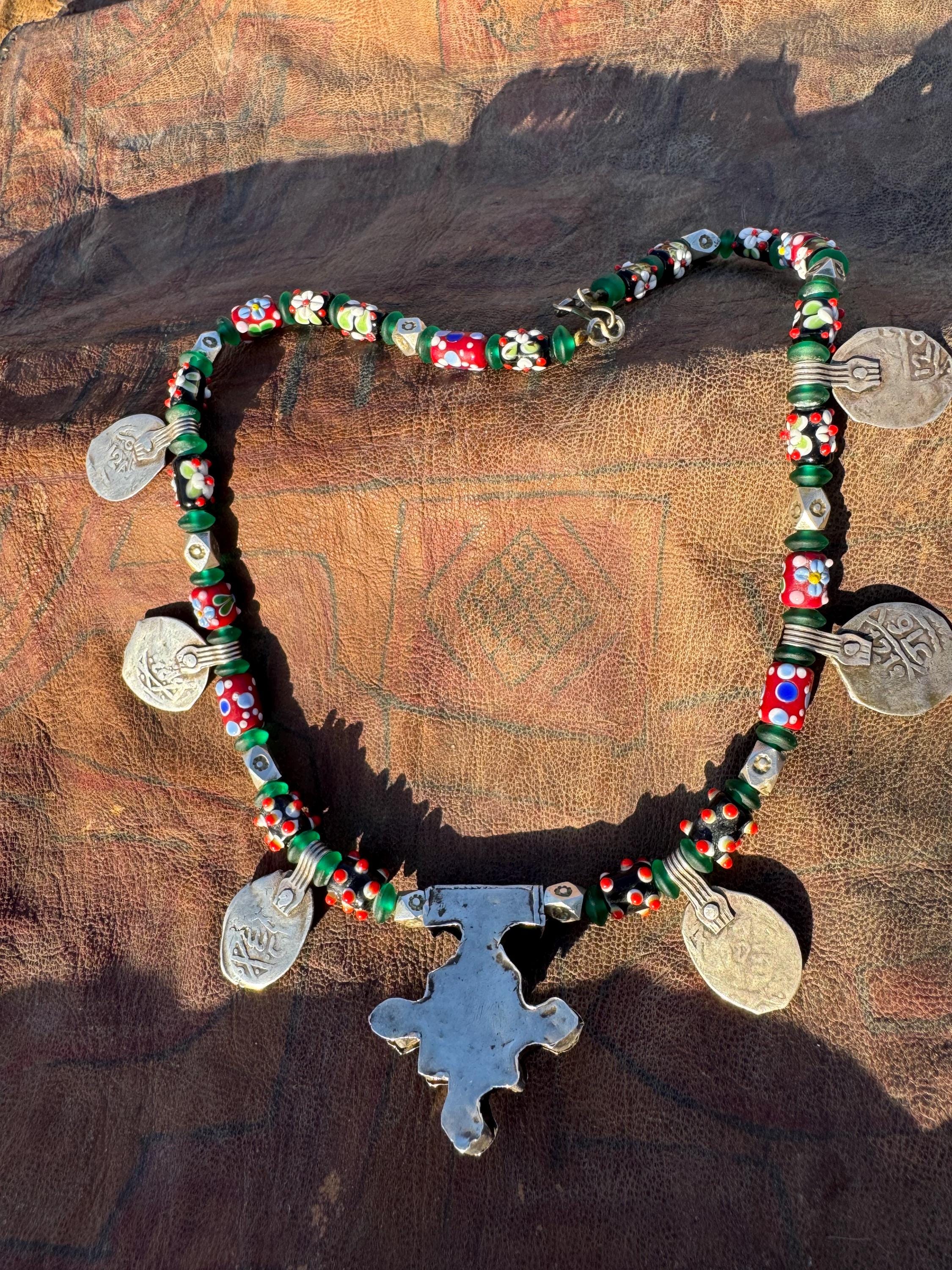 Berber necklace composed ,Berber Silver boughdad pendant,antique berber silver coins,vintage Berber silver bead and African trade bead .