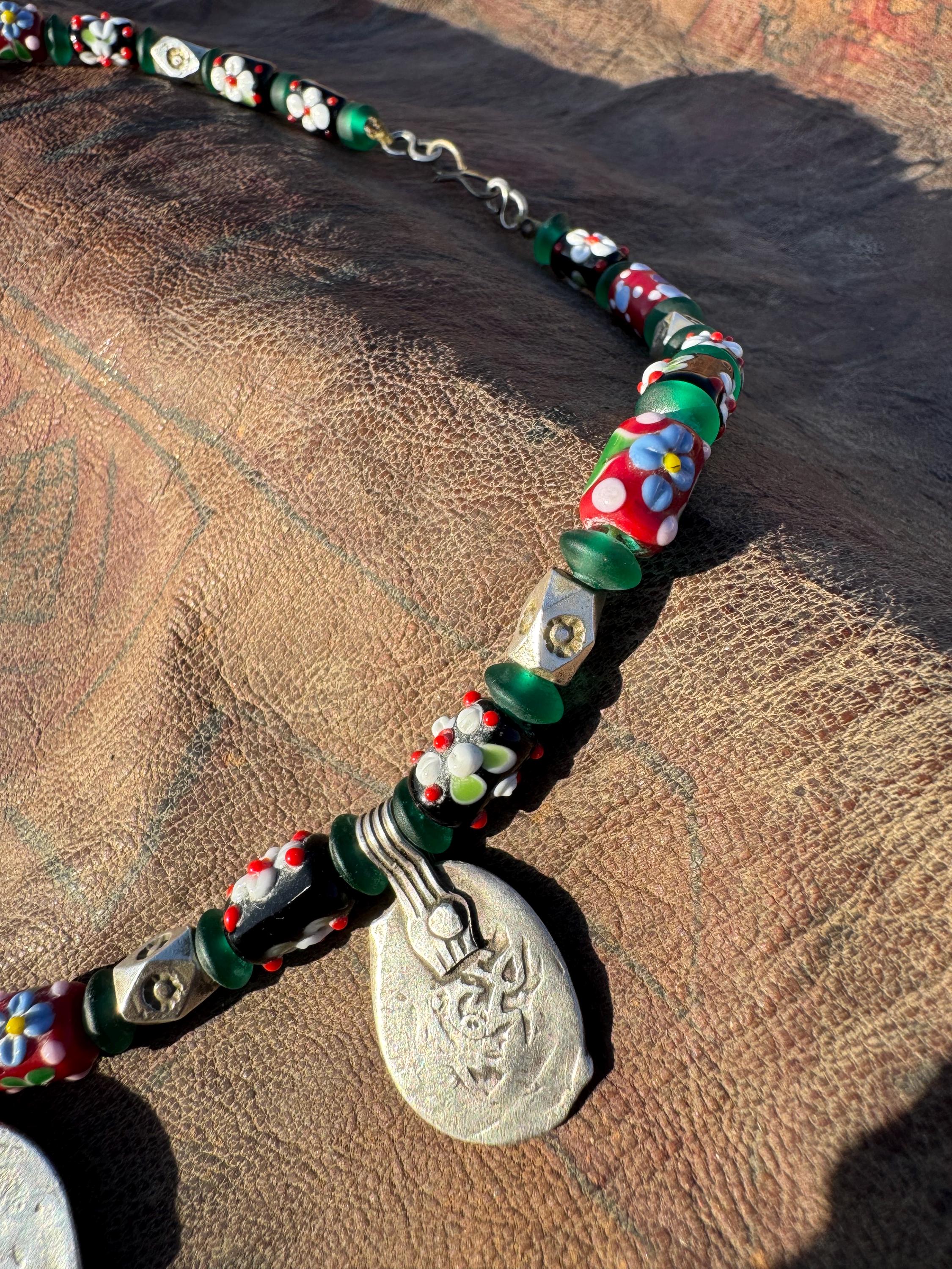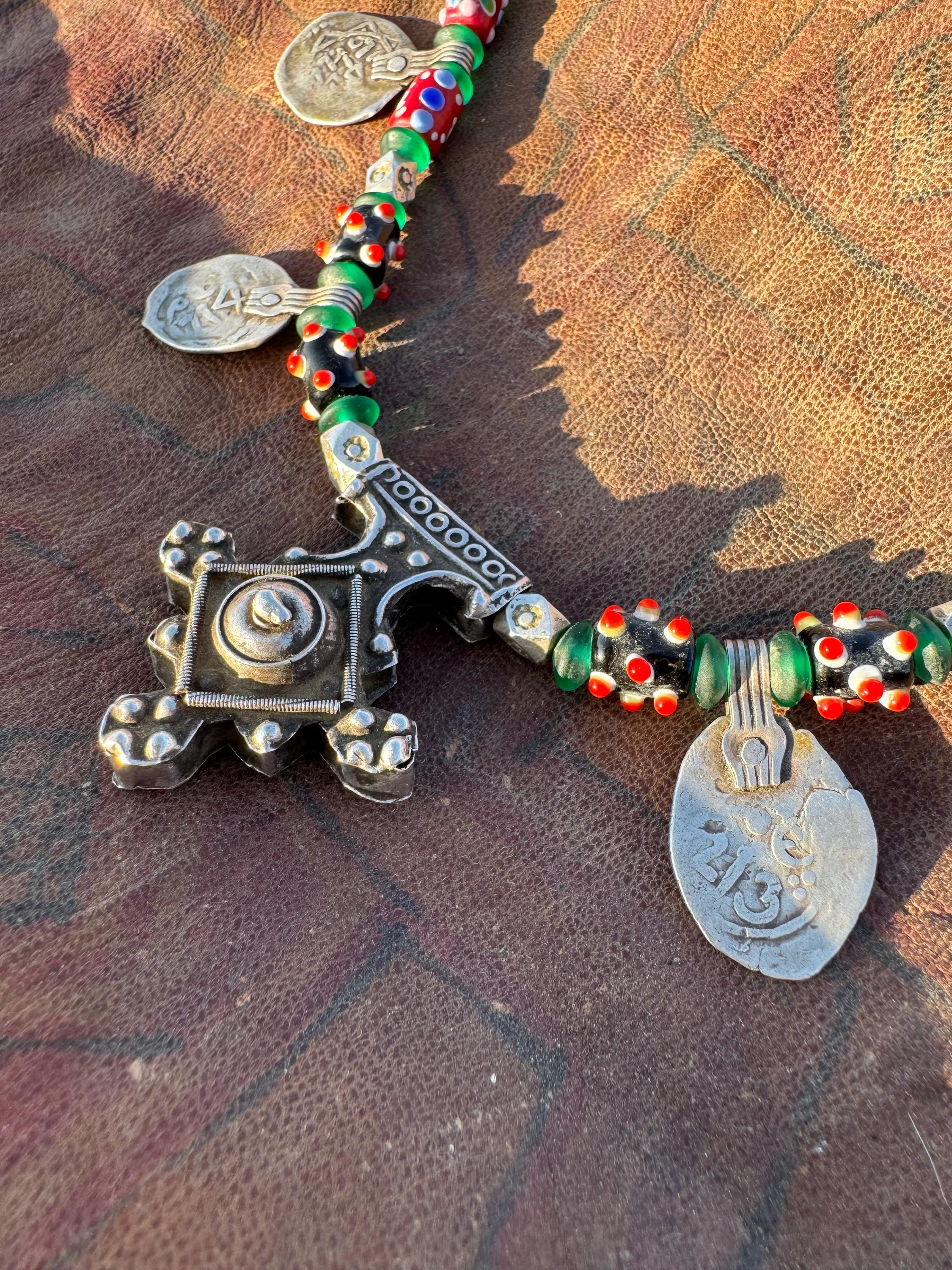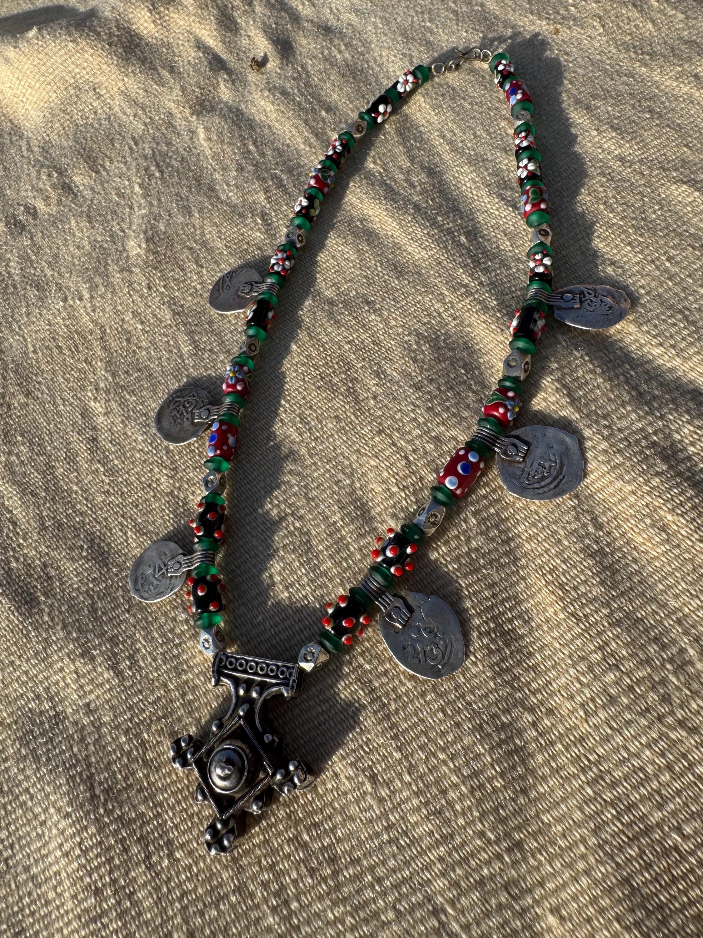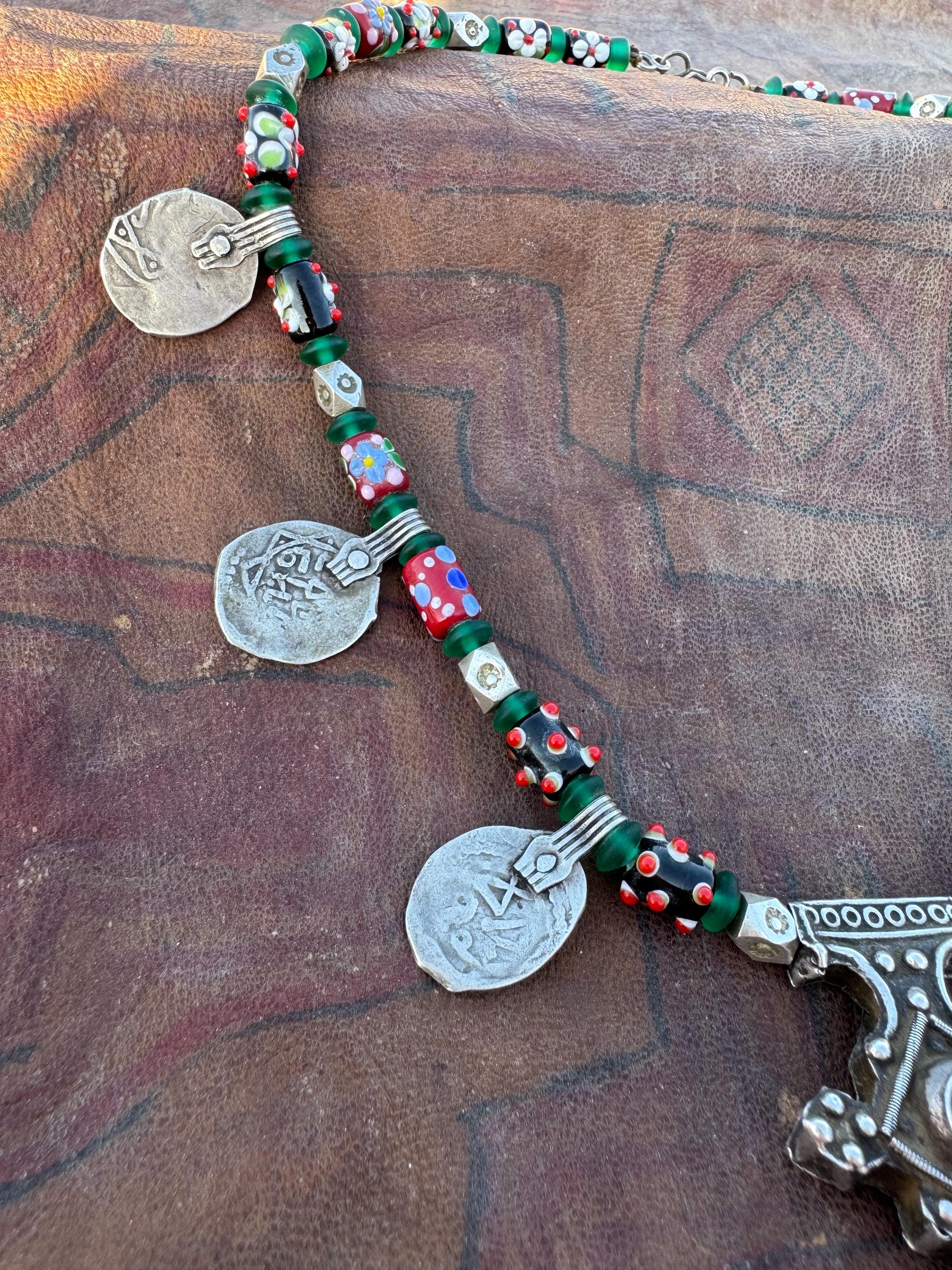 Berber necklace composed ,Berber Silver boughdad pendant,antique berber silver coins,vintage Berber silver bead and African trade bead .