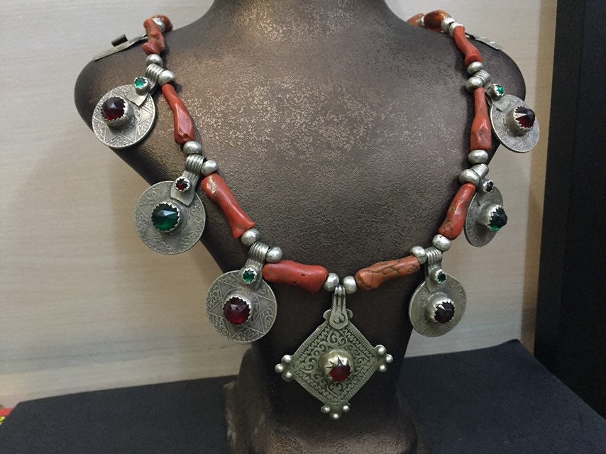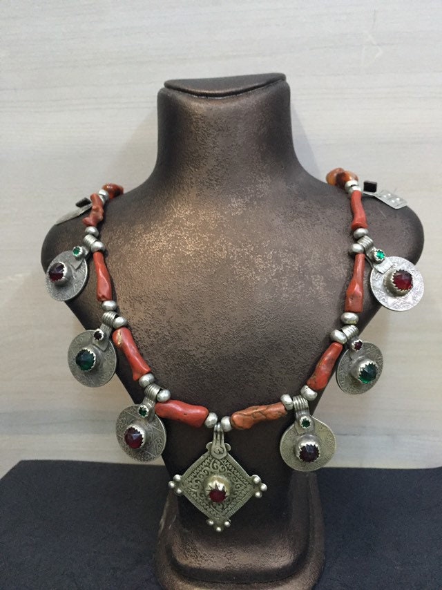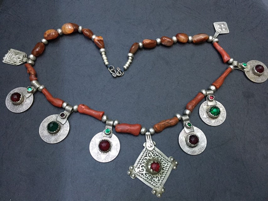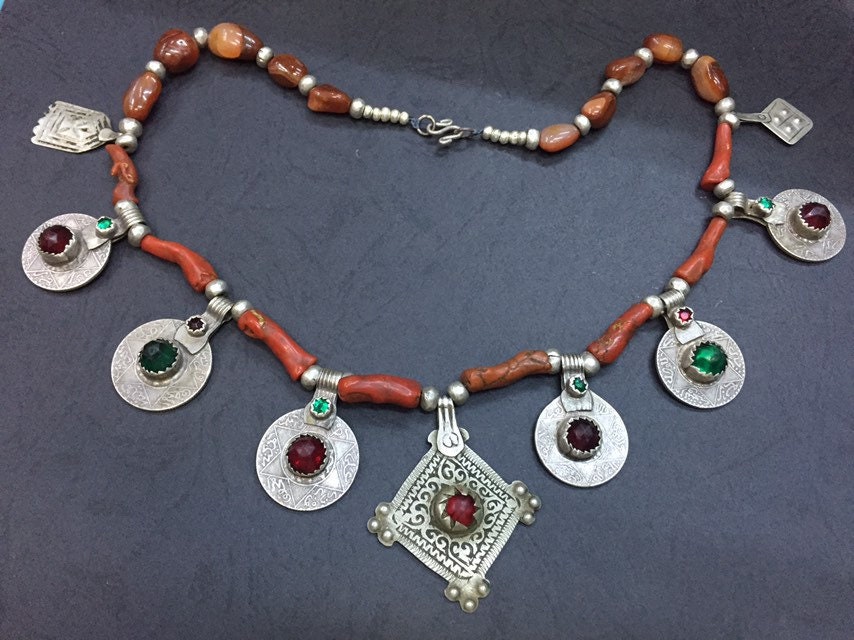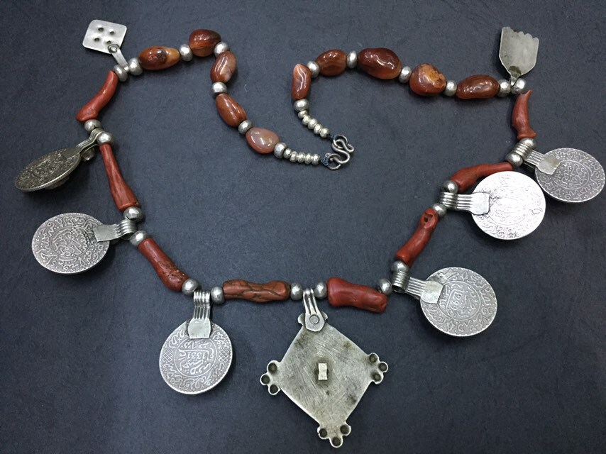 Silver necklace composed vintage natural Berber Mediterranean coral,antique berber silver coin pendants,antique berber silver bead,vintage natural carnalian.