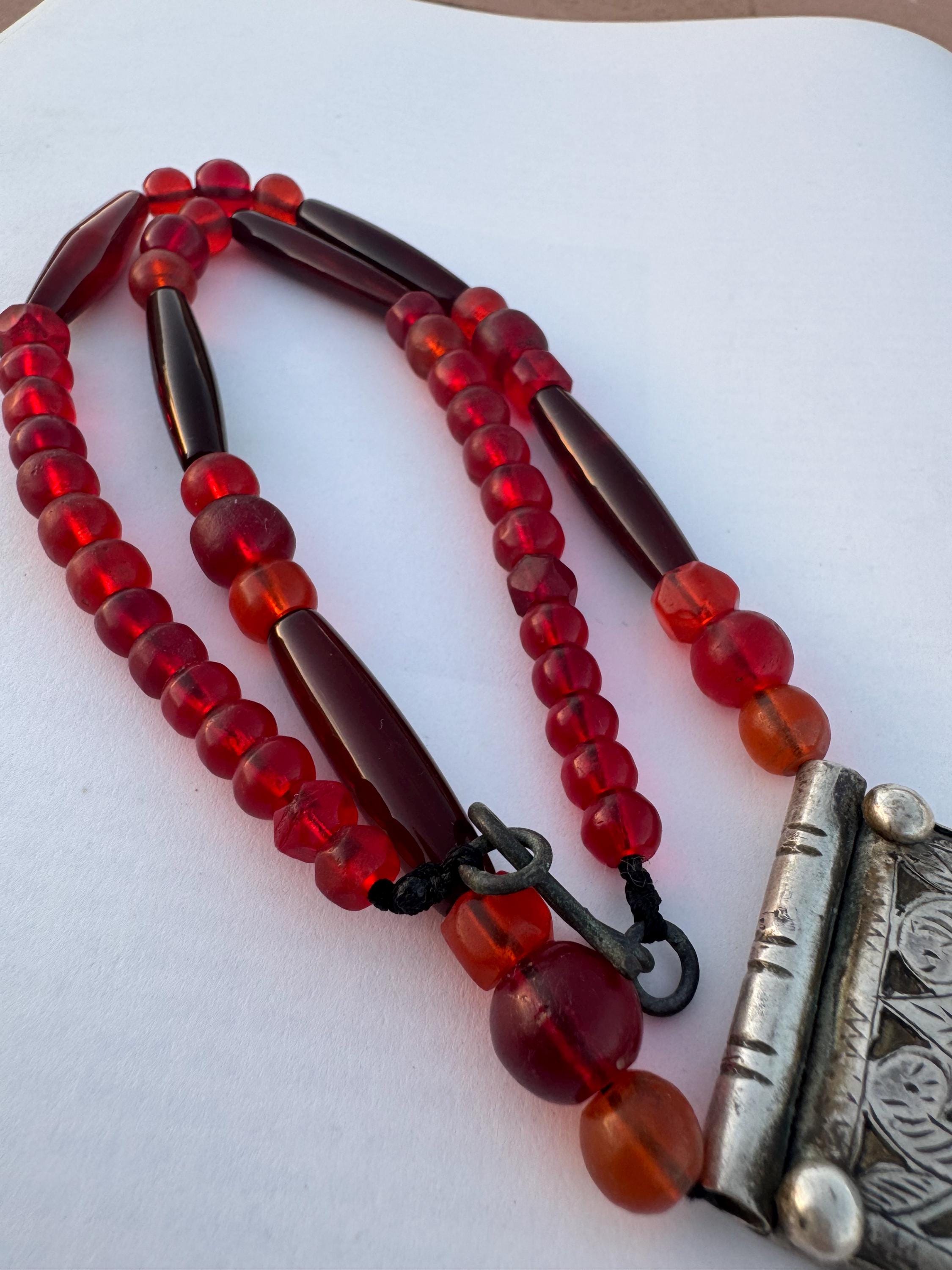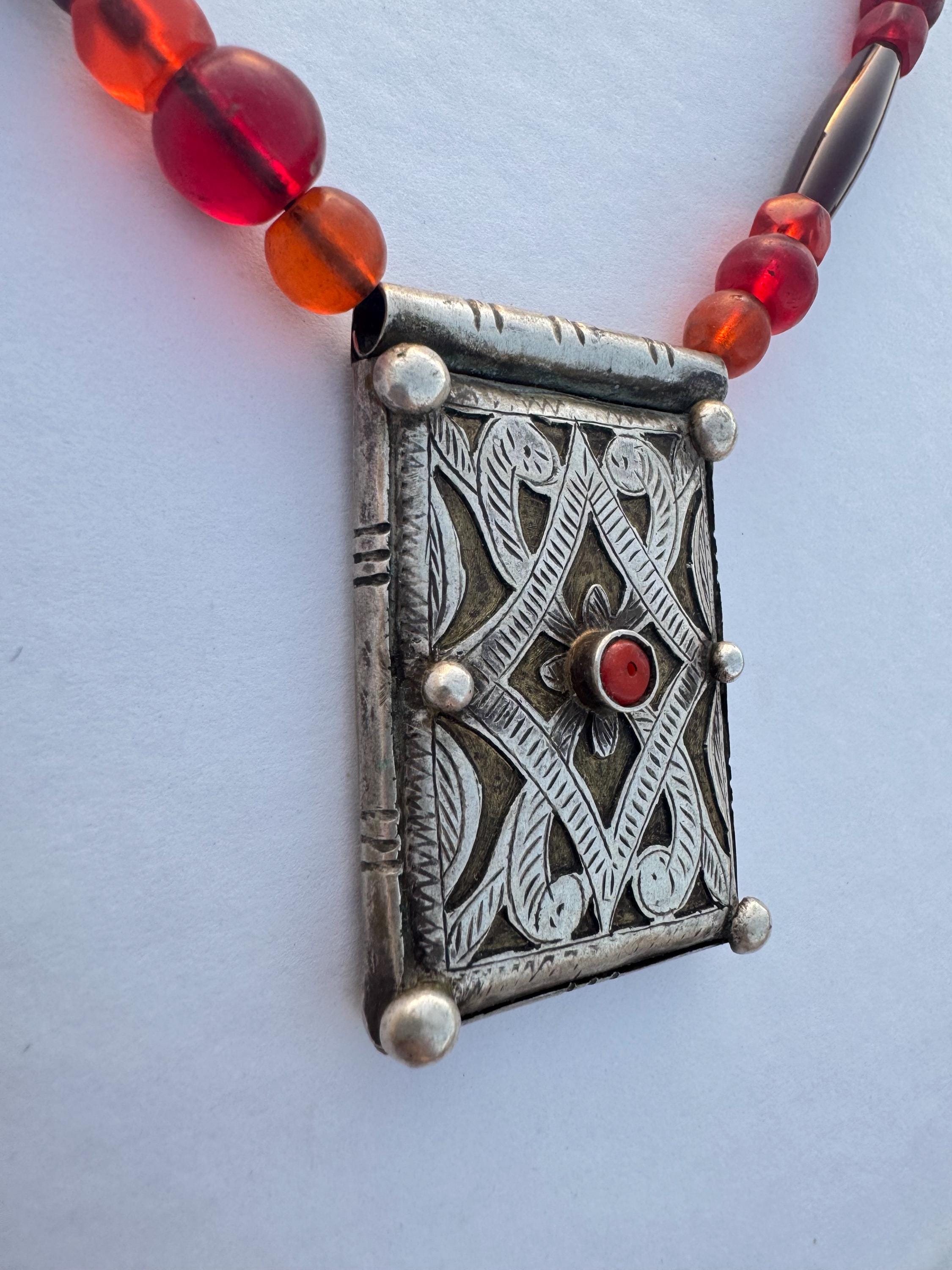 Necklace composed of;Handmade berber silver kitab talisman,Carnalian,Natural coral,antique african glass bead,silver clasp.