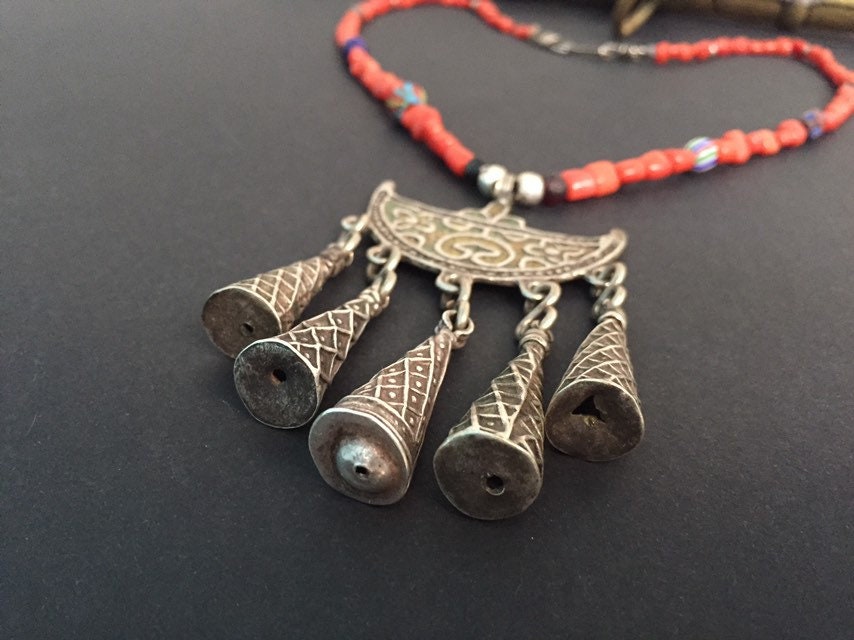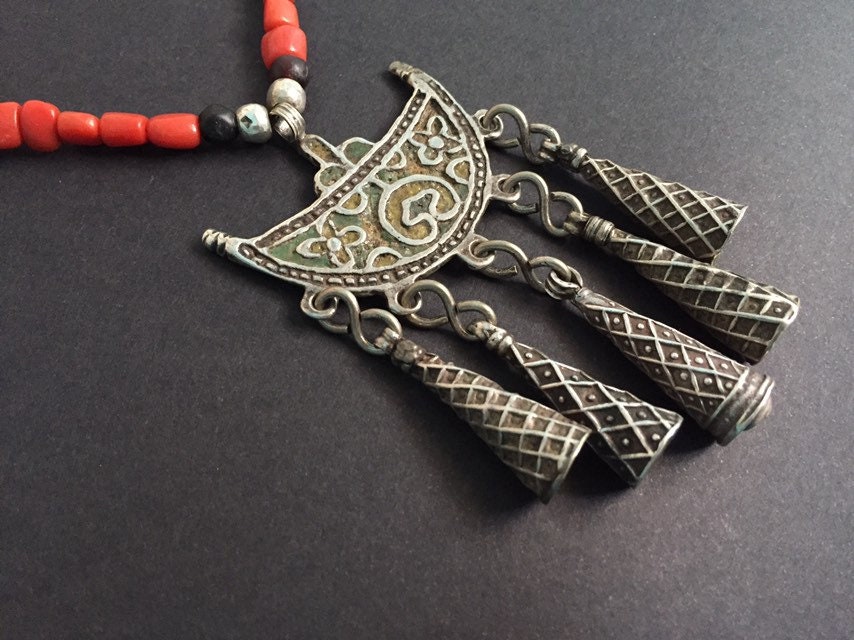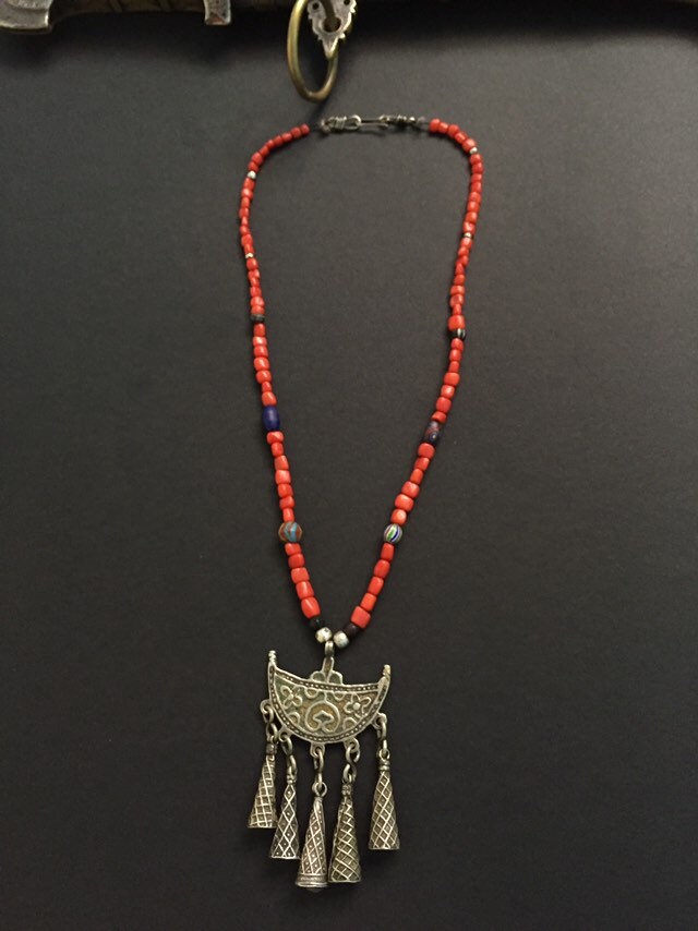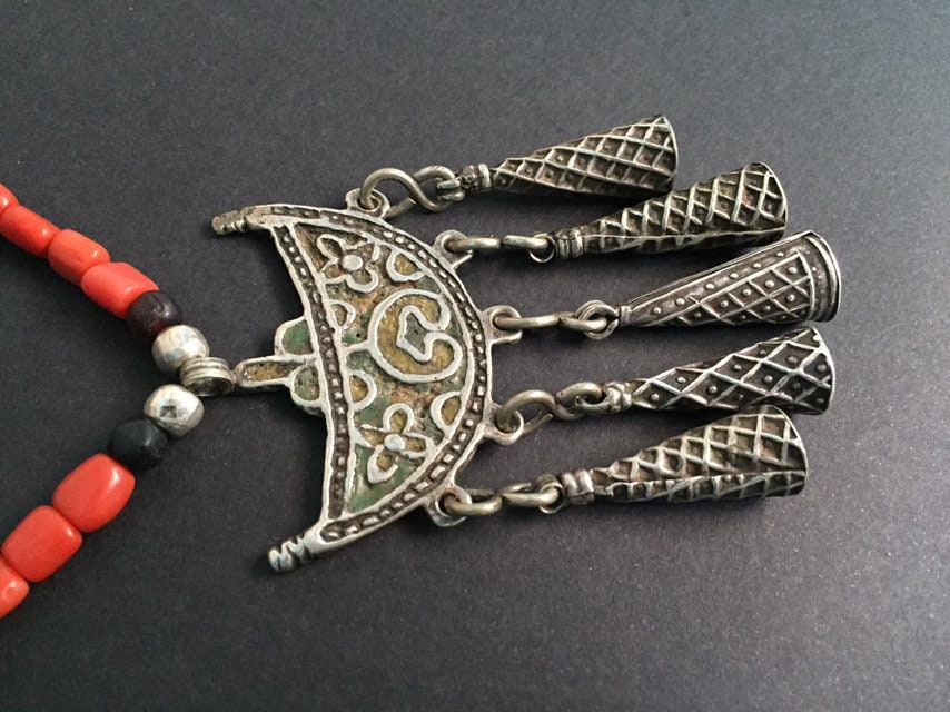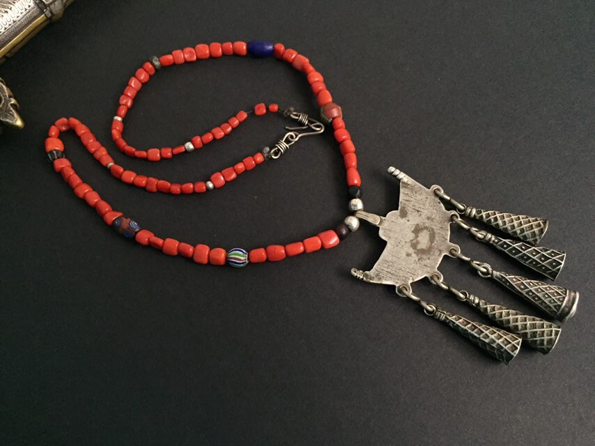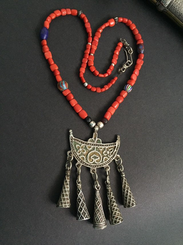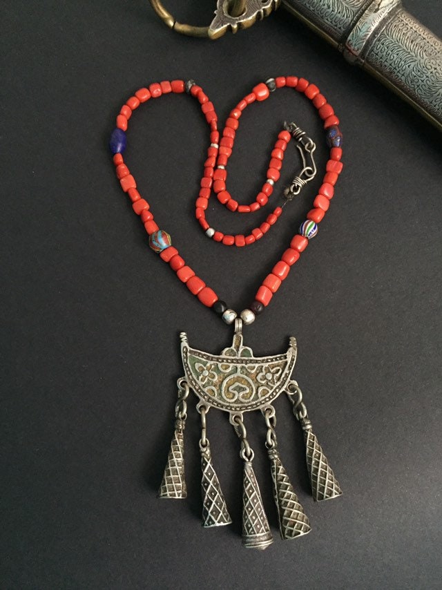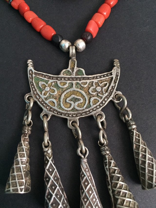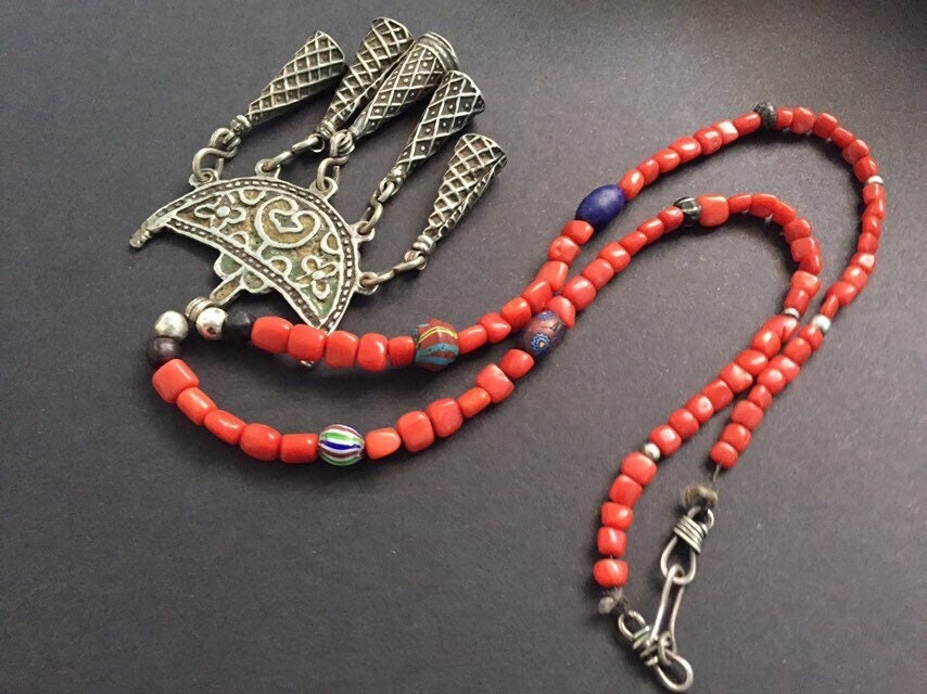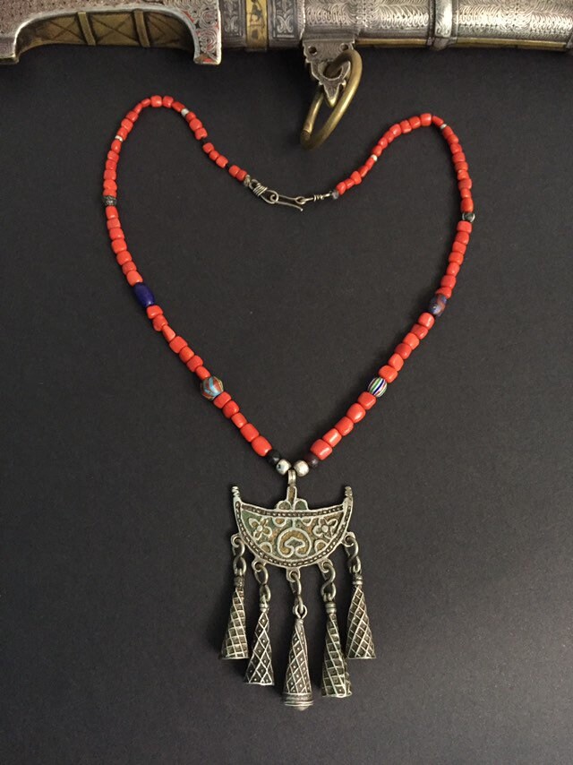 Composed antique berber enamel silver pendant,beautiful Mediterranean natural coral,antique African trade beads,antique berber silver bead.