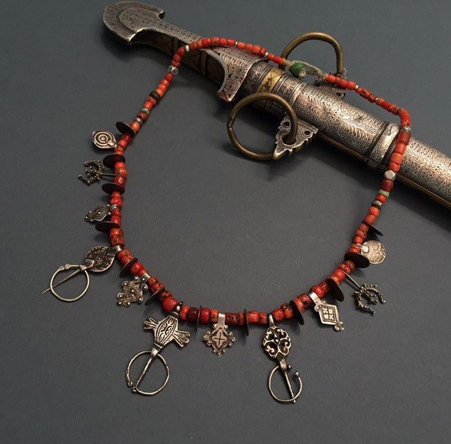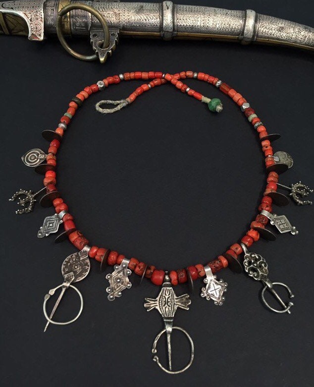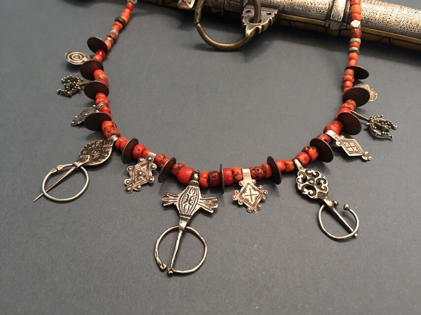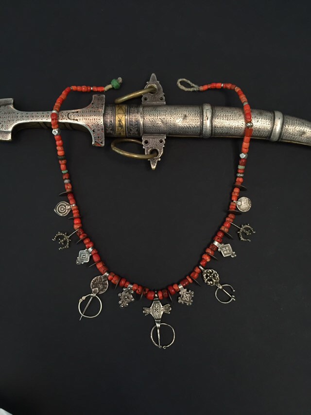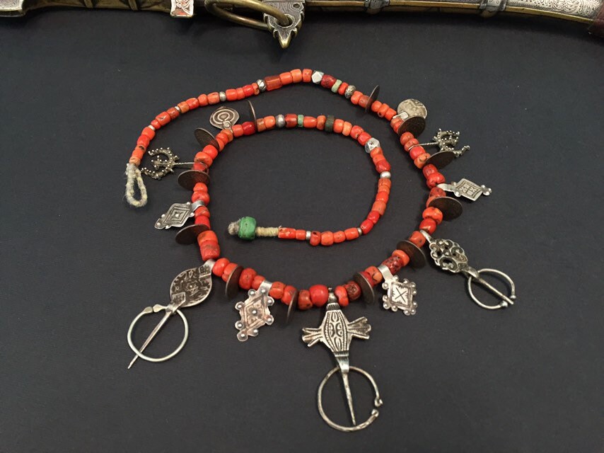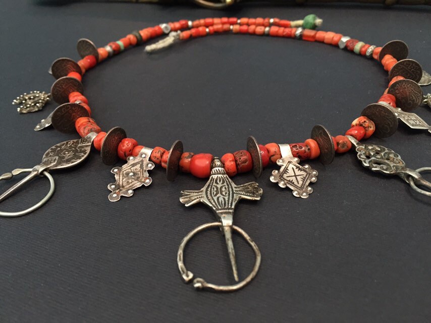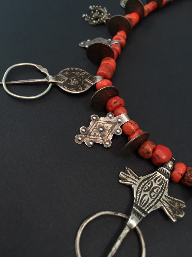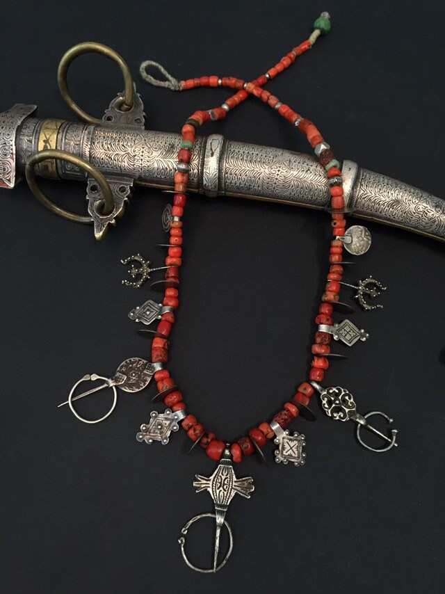 Necklace includes three antique Fibule from three different regions of Morocco-Ida Ousmlal,Zagora and Essauera.Antique Moroccan coins,antient amazonite,rare niello pendants,antique silver and glass beads,amulets in a shape of “pigeon feet”(Berber symbol of fertility,prosperity and wisdom)are composing rare necklaces which is strung on twisted cotton fiber with green Hebron bead at the end.Antique Berber Mediterranean coral is adding contrast to this wonderful necklace with stunning patina.