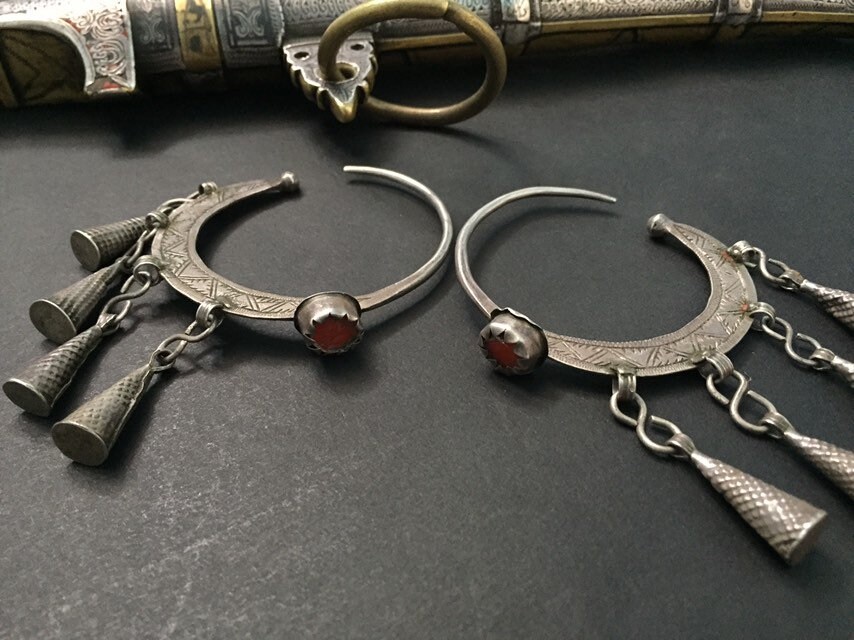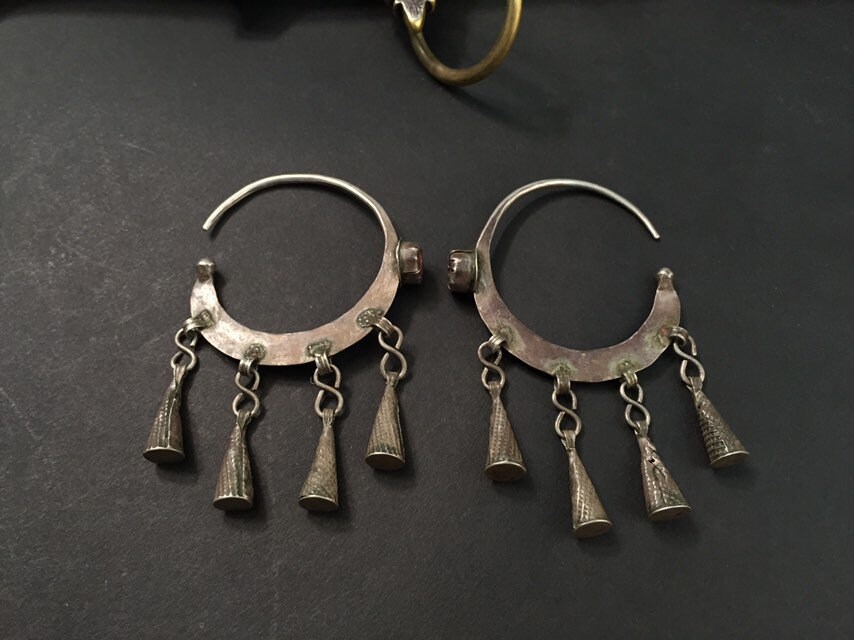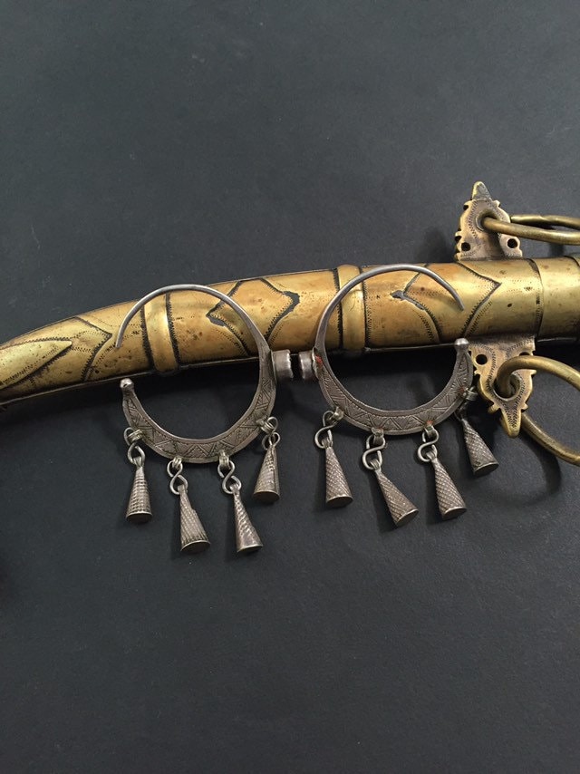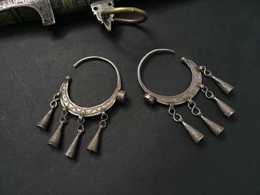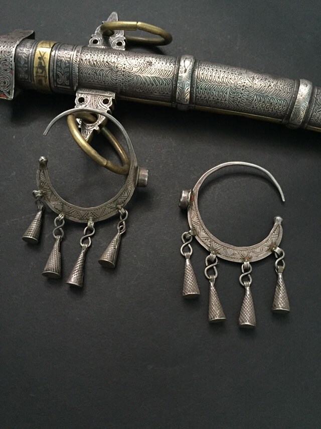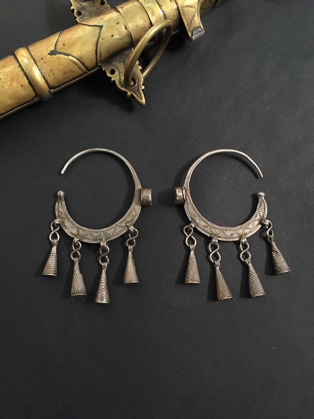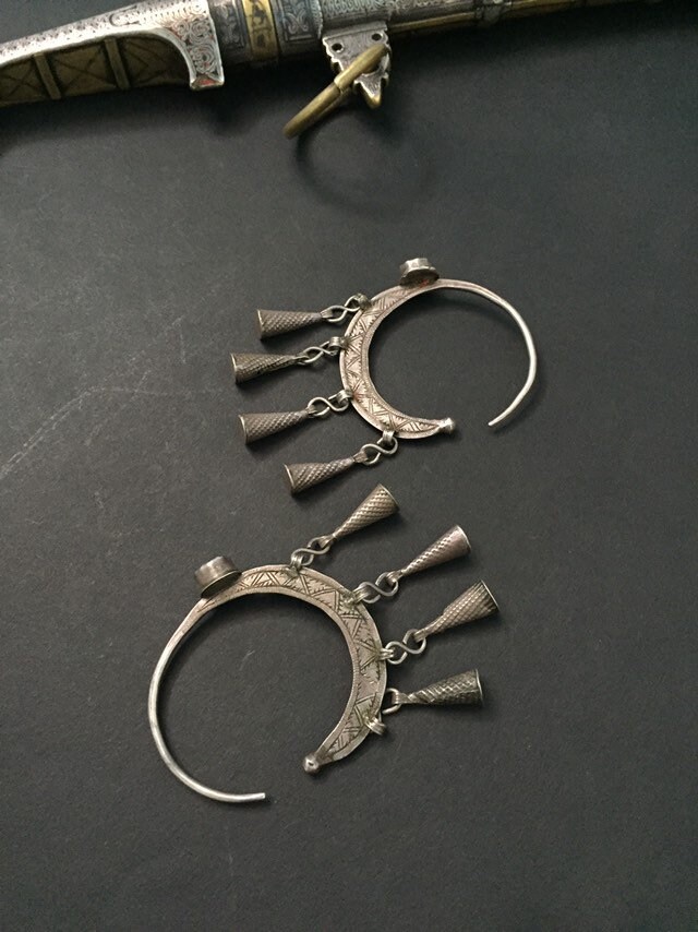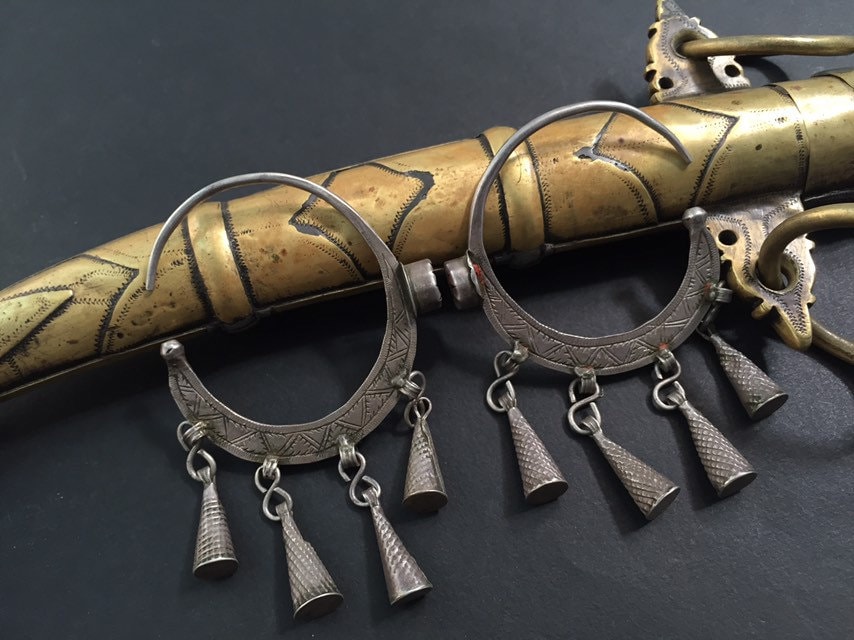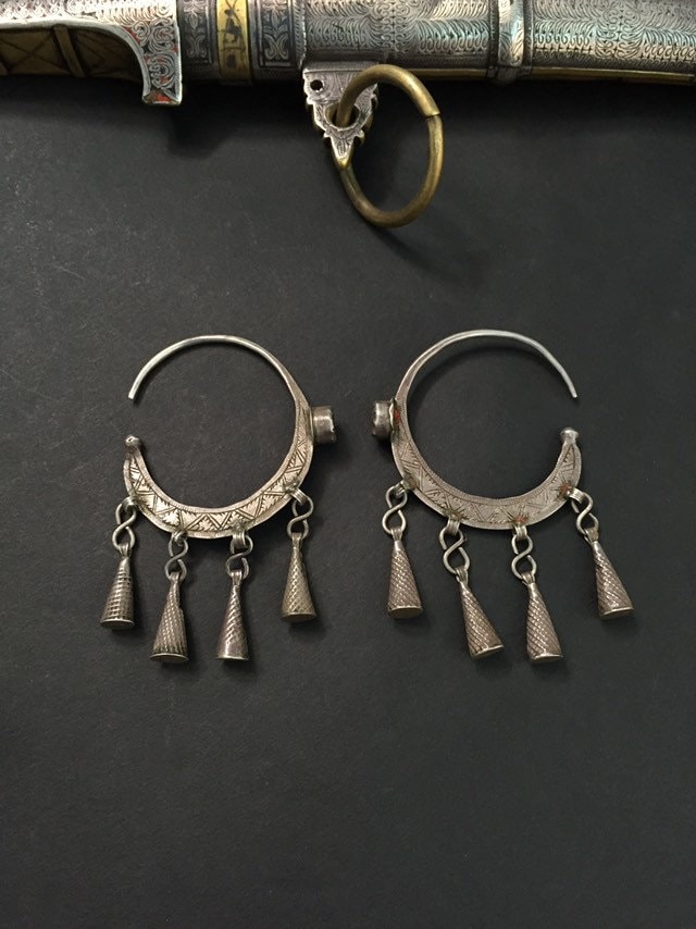 Berber silver chiseled crescent earring region Ait Ouaouzguit from 1950s.