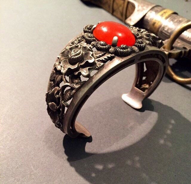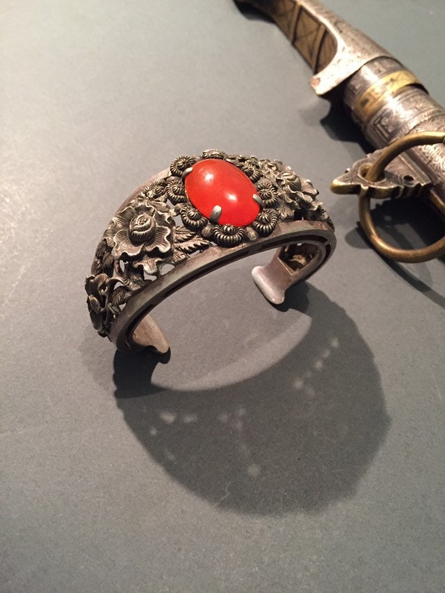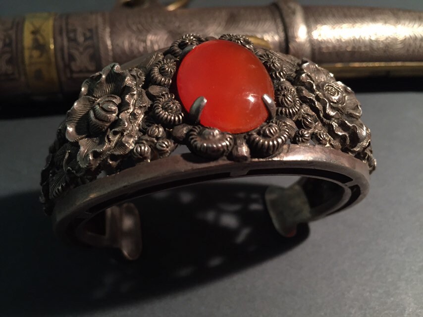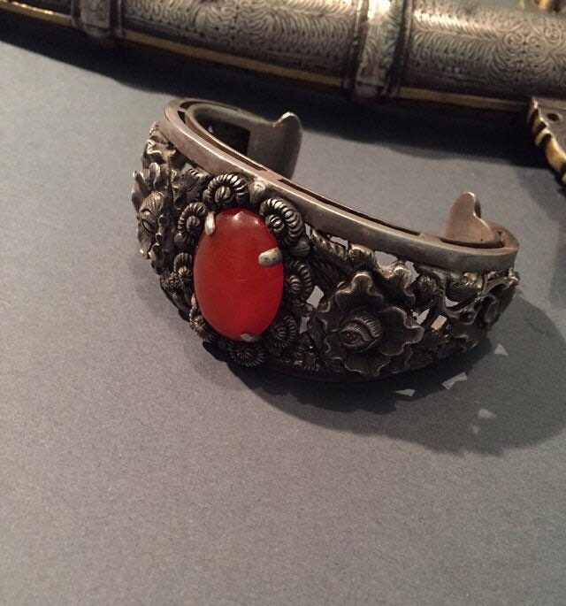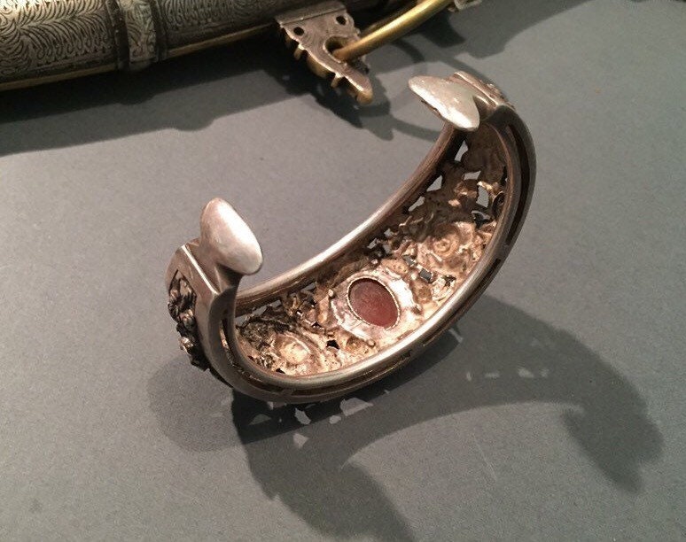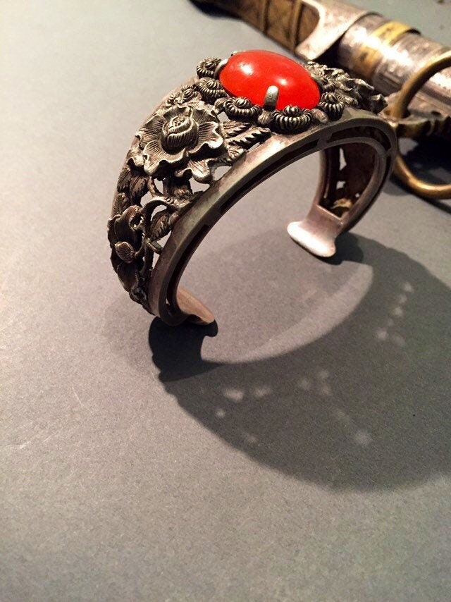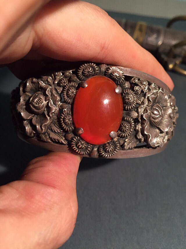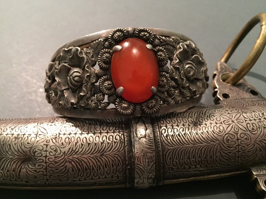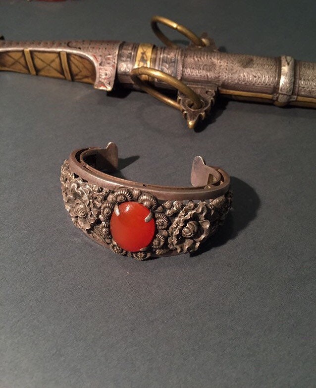 The silver designs are delicate florals and red carnelian stone.