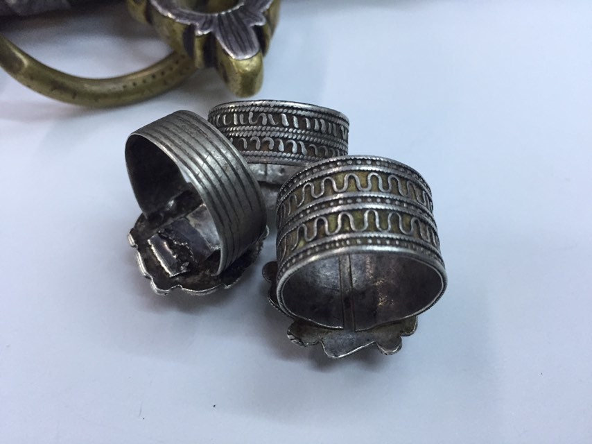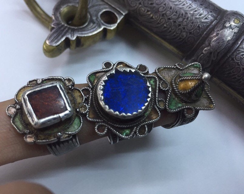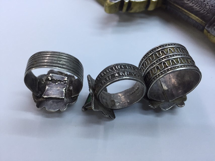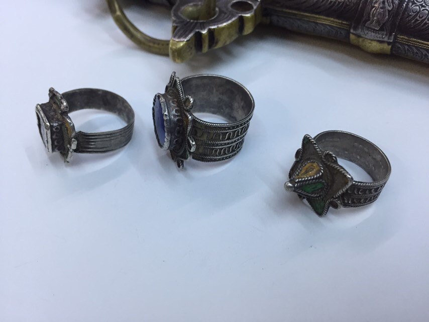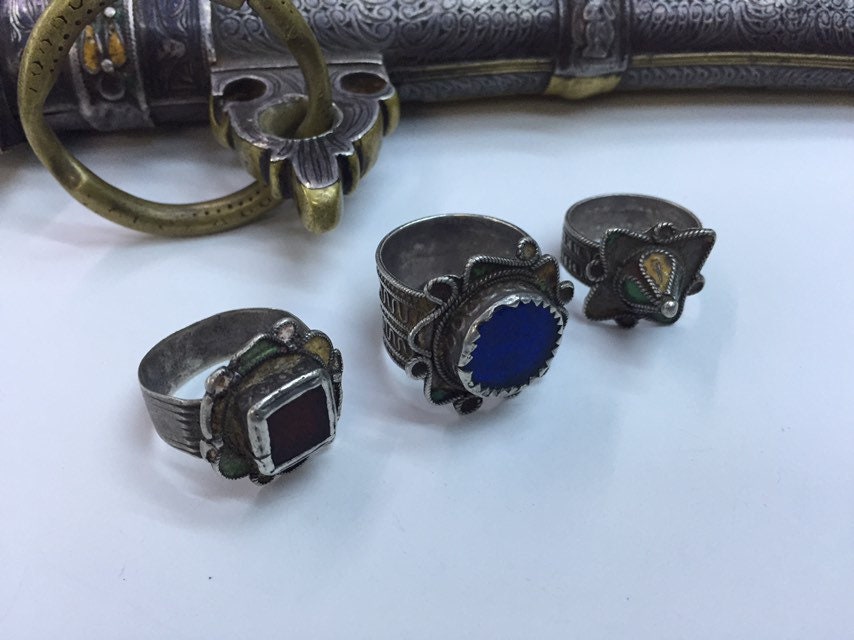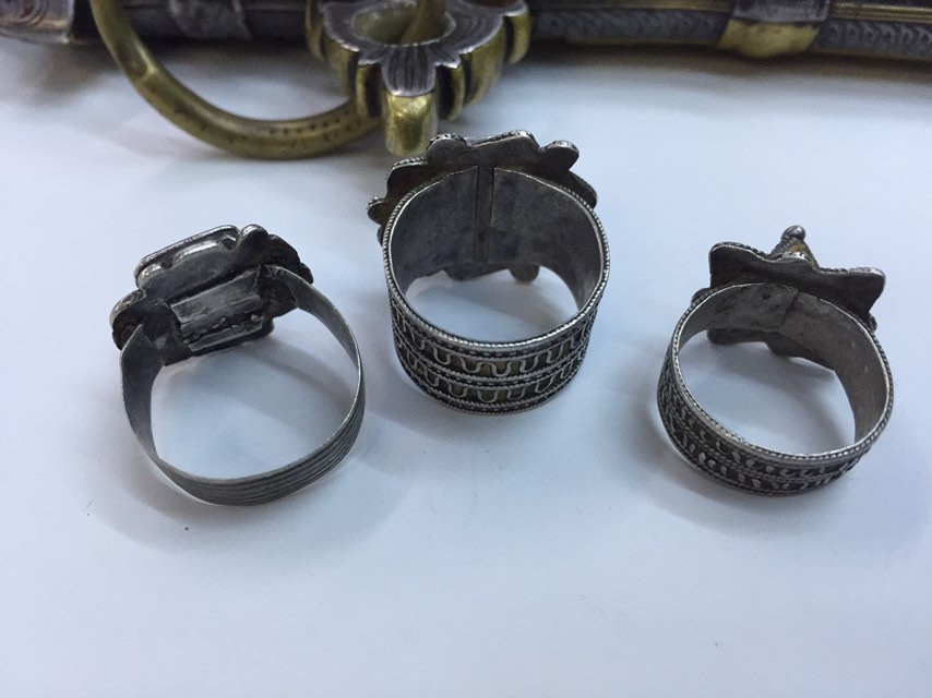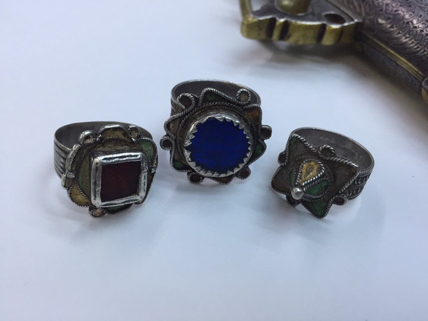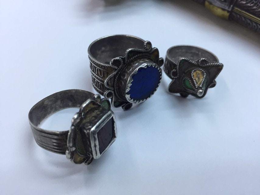 3 Antique Berber silver enamel rings with antique glass,region southern of Morocco.
